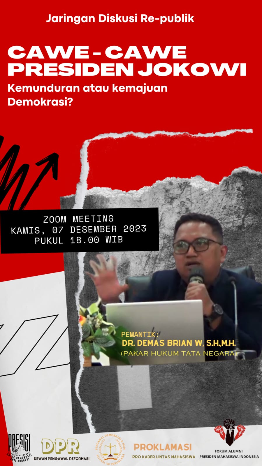 Diskusi yang dilaksanakan secara online tersebut mengangkat tema “Cawe-cawe Presiden Jokowi, Kemunduran atau kemajuan Demokrasi?” Turut hadir ratusan peserta diskusi yang terdiri dari Mahasiswa, Tokoh Masyarakat dan Para Akademisi. Dengan pemantik diskusi Dr. Demas Brian W, S.H.,M.H. selaku Pakar Hukum Tata Negara.