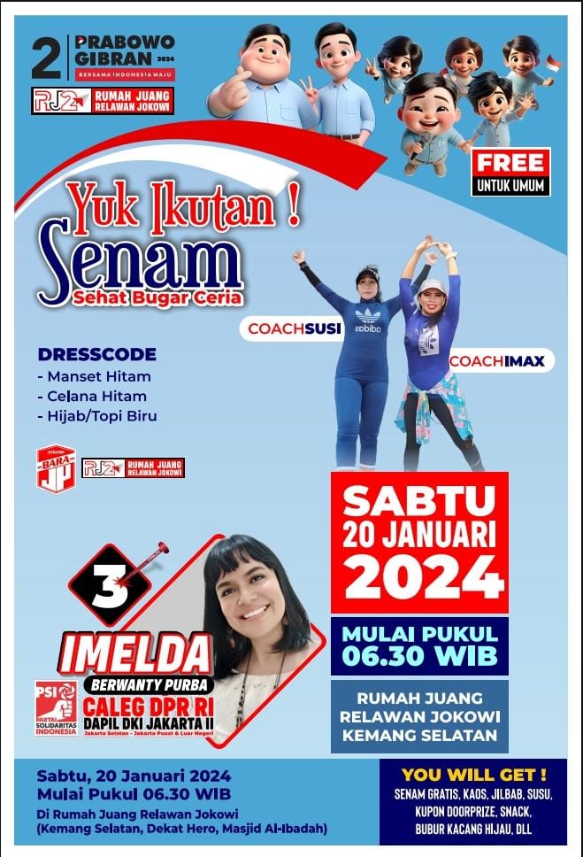 “Ada 350 peserta lebih wanita yang hadir pada senam gemoy sehat, walaupun pagi ibu-ibu sudah sibuk sekali mengurus rumah tangga tapi demi cintanya kepada Pak Prabowo dan Gibran mereka hadir di rumah Juang Relawan jokowi di Kemang Jakarta Selatan,” tuturnya, Sabtu ( 20/01/2024 ).