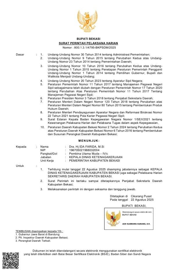 Bupati Bekasi Ade Kuswara Kunang menunjuk Hj. Ida Farida sebagai Pelaksana Tugas Harian (Plh) Sekertaris Daerah (Sekda),penunjukan tersebut tertuang dalam Surat Perintah Pelaksana Harian, Nomor: 800.1.3.1/4795/BKPSDM/2025.