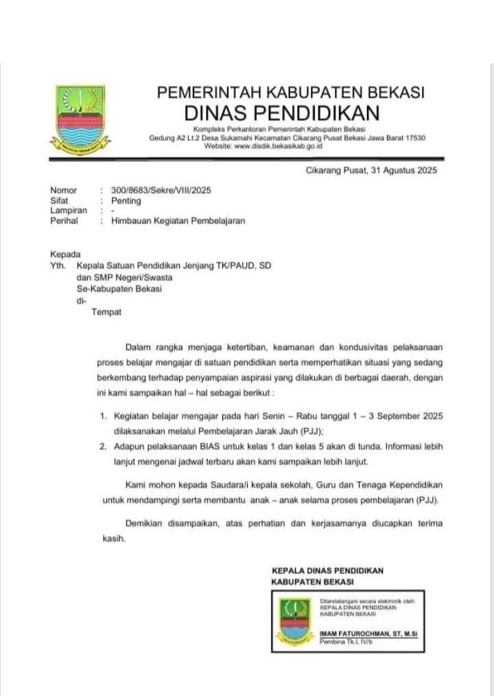 Hal tersebut diberlakukan dalam rangka menghadapi situasi yang terus berkembang, Dinas Pendidikan Kabupaten Bekasi telah mengeluarkan himbauan kepada seluruh sekolah mulai dari TK/PAUD, SD, hingga SMP baik negeri maupun swasta untuk melaksanakan pembelajaran secara daring atau Pembelajaran Jarak Jauh (PJJ) mulai tanggal 1–3 September 2025.
