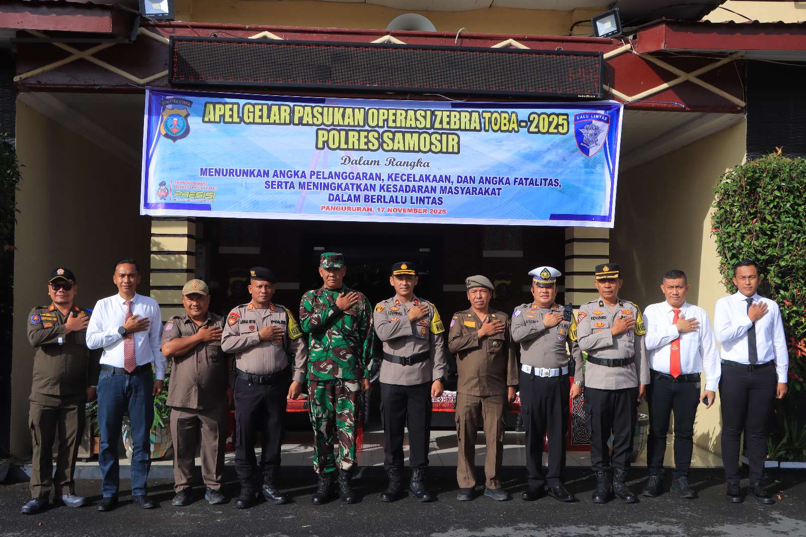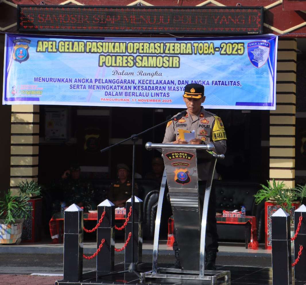 Polres Samosir melaksanakan Apel Gelar Pasukan Operasi Zebra Toba Tahun 2025 pada Senin (17/11/2025) pukul 08.00 WIB di Lapangan Mako Polres Samosir. Kegiatan ini digelar untuk memastikan kesiapan personel dan sarana prasarana dalam rangka mendukung terciptanya keamanan, keselamatan, ketertiban, dan kelancaran lalu lintas di wilayah Kabupaten Samosir.