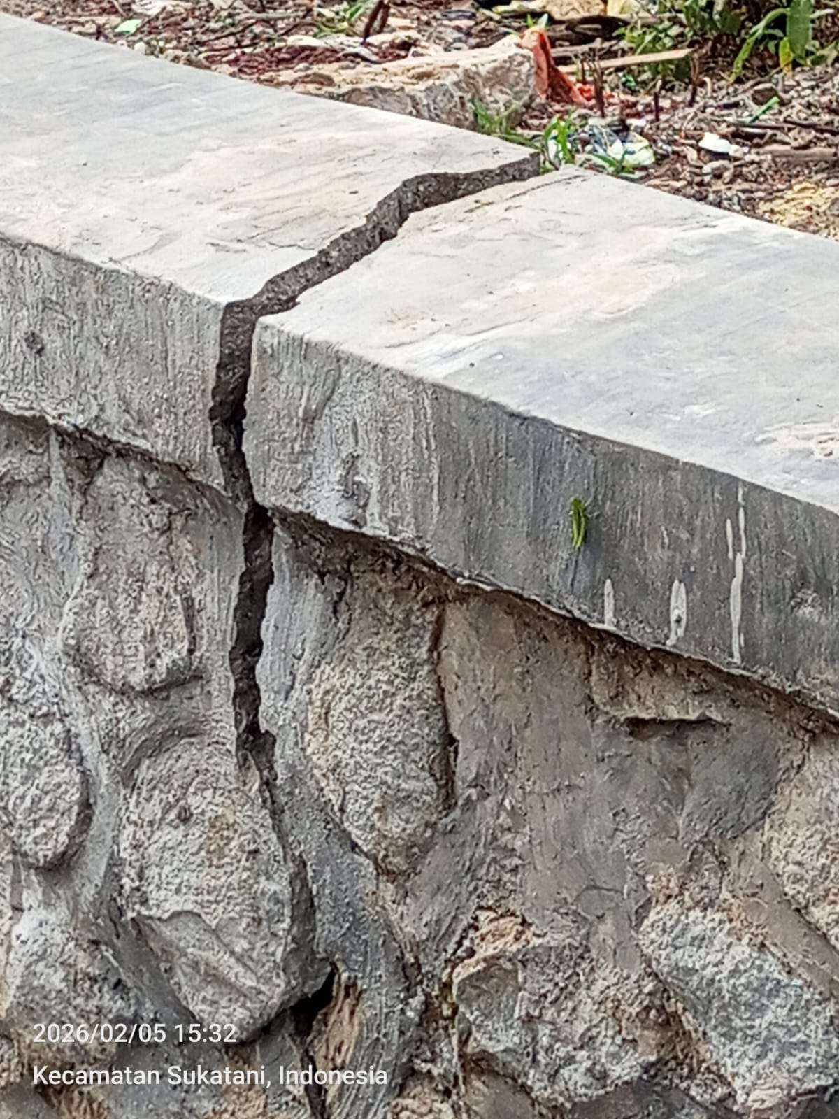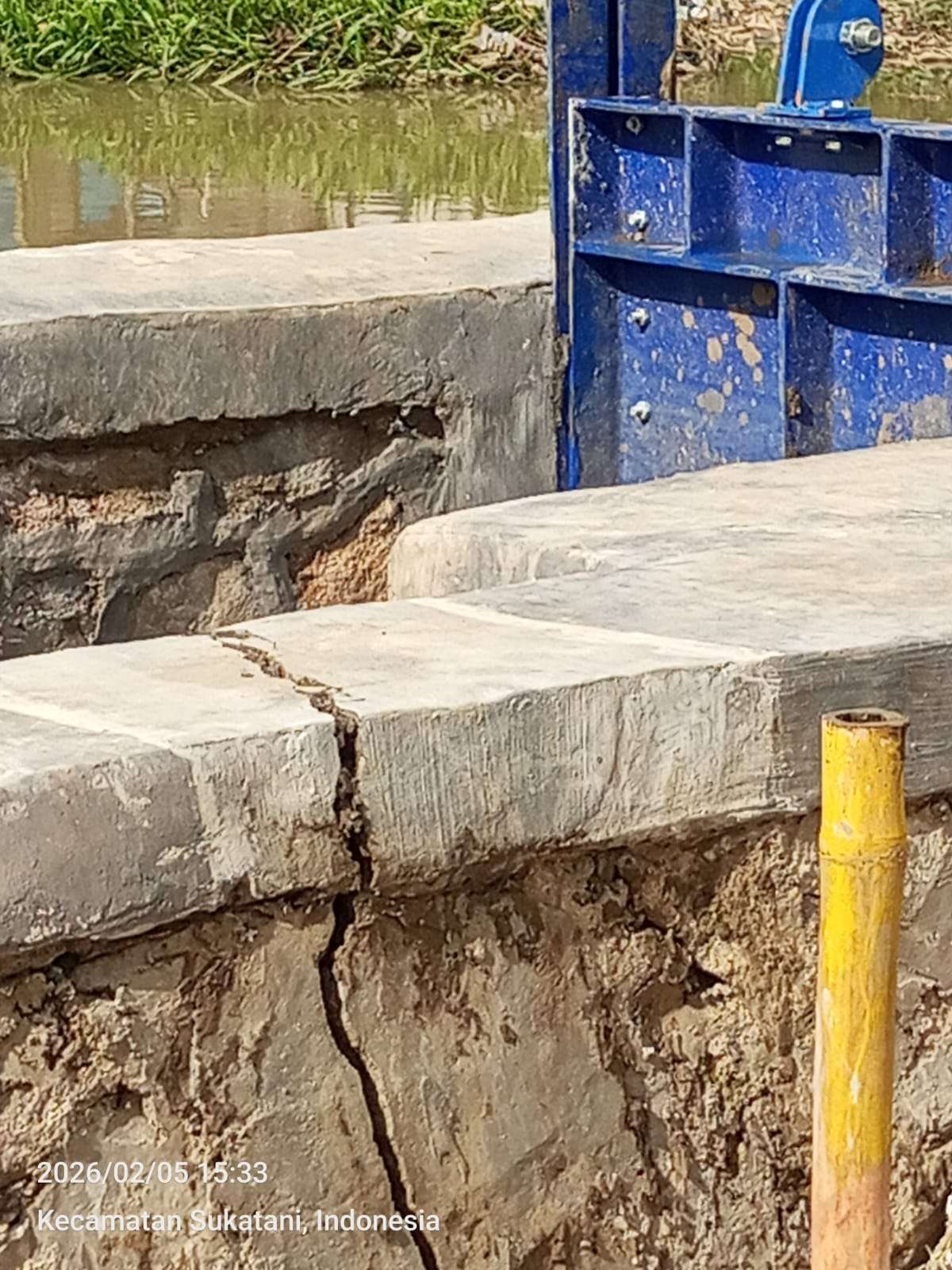Meski baru berusia satu bulan, penyangga beton pintu air ditemukan telah patah dan hancur, menunjukkan adanya indikasi kuat cacat mutu sejak awal pembangunan.