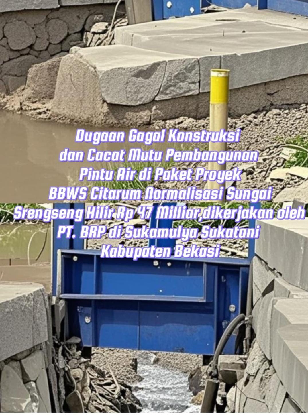 Pembuatan Pintu Air di Proyek Normalisasi Sungai Srengseng BBWS Citarum oleh PT.BRP Senilai 47 Miliar di Sukatani Patah dalam Satu Bulan
